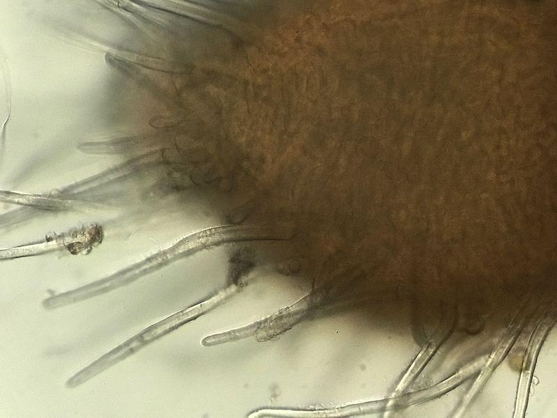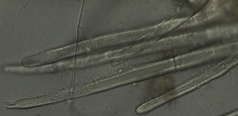 Poils hyalins, septés, à paroi épaisse (sommet sans lumière), -> 165 µ de long, -> 13 µ d'épaisseur vers la base.