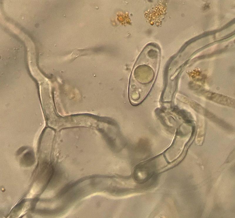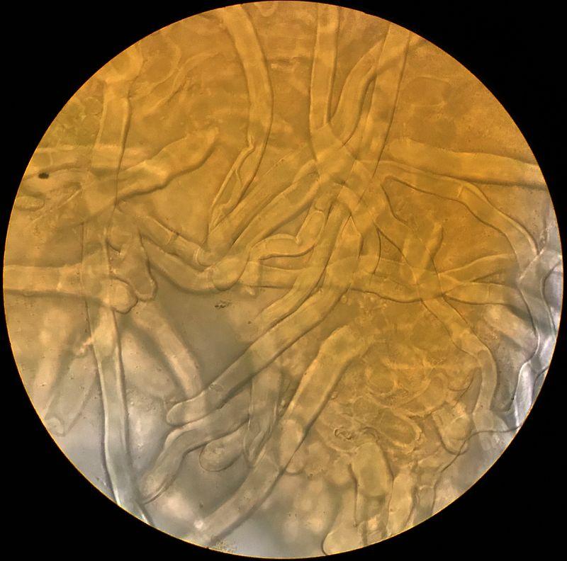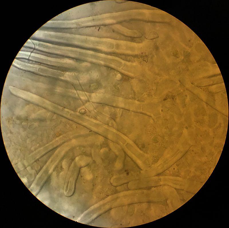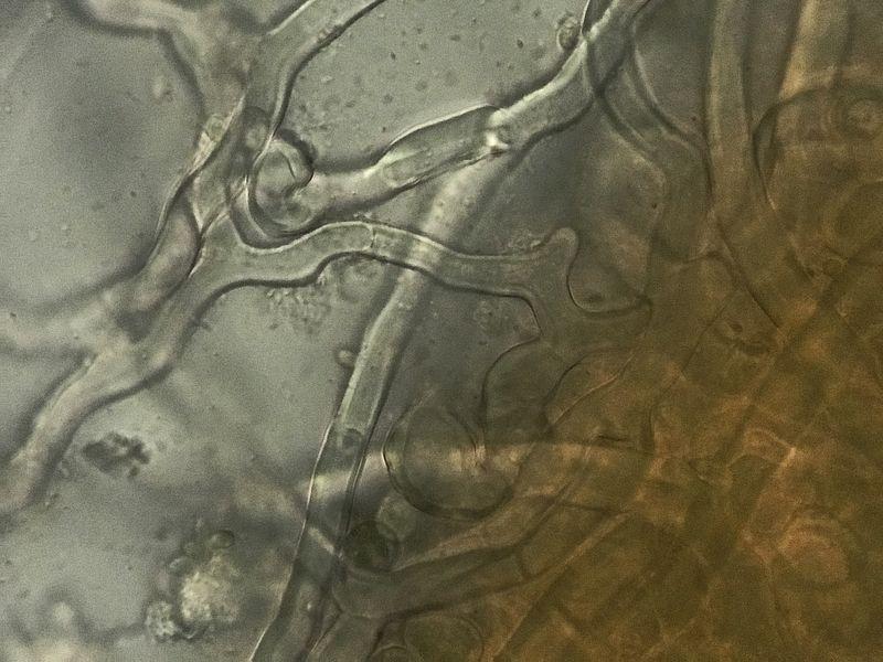 Hyphes tarabiscotées hyalines, septées, à paroi assez épaisse, -> x 13µ