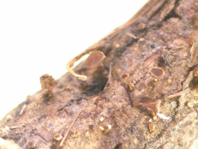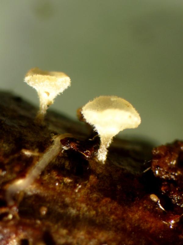 Fbs: c0.5mm. Stipitate, hairy, whitish, strongly strongly discolouring dark red-brown.