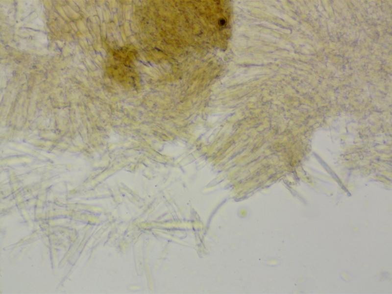 Fbs: c0.5mm. Stipitate, hairy, whitish, strongly strongly discolouring dark red-brown.