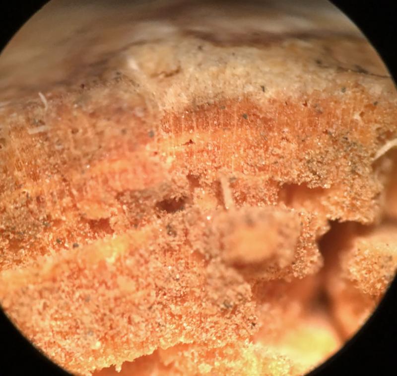 I also am including here images of a crosscut of the branch. Without much experience in this type of wood identification, I can't say much. But I think the pores are pretty uniformly small. There are faint radial rays.