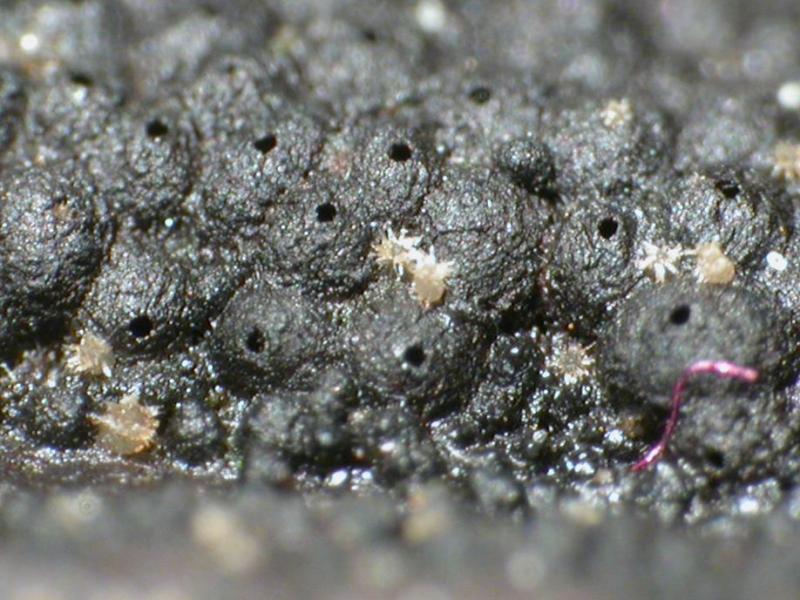 J'ai récolté ce pyrénomycète sur vieux Nemania. Taille des périthèces : environ 0,2 x 0,1-0,15 mm, KOH et acide lactique sans effet.