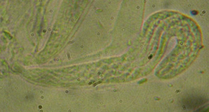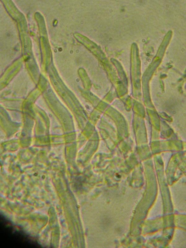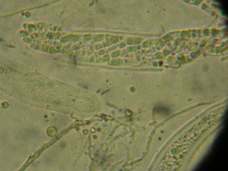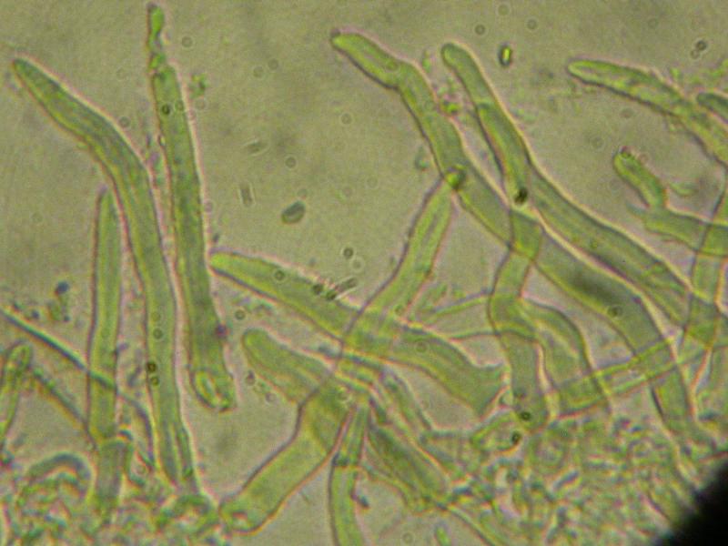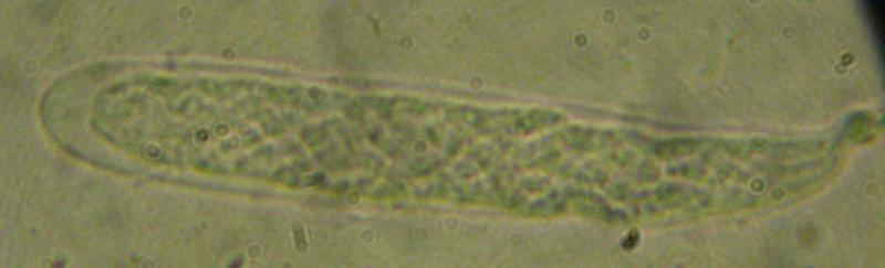 Spores filiformes, 2,5-3,5 µm de diamètre pour au moins 50 µm de longueur, mais probablement beaucoup plus... Impossible de bien mesurer car elles sont emmêlées entre elles dans les asques et elles en sortent difficilement (maturité insuffisante ?).