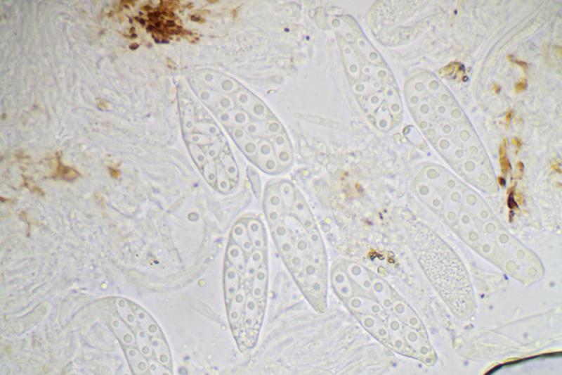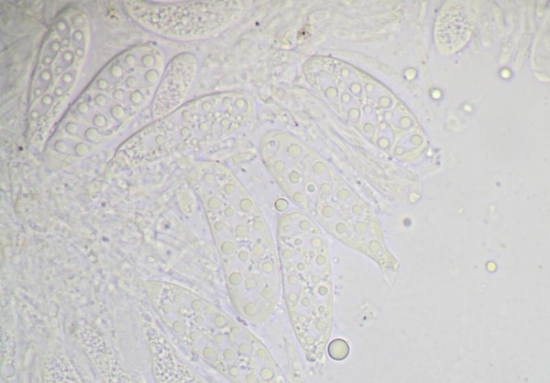 Asques : 30-35 x 6,5-10 µm, octosporés, à sommet non amyloïde, sans crochet.
