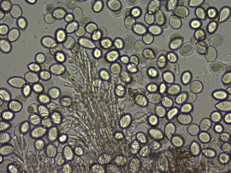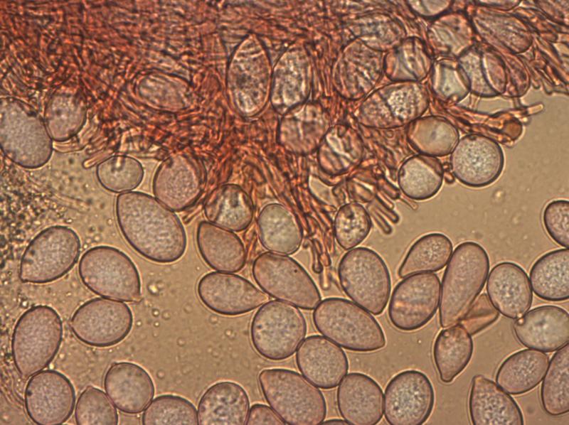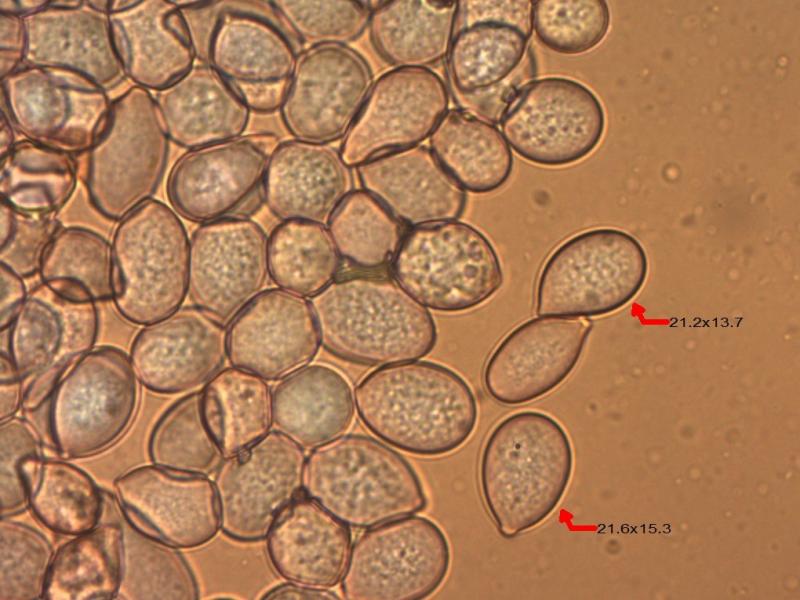 I think you are right with Pachnocybe albida, the spore size fits to my find and also the thick-walled hyphae I think to see on your pictures.