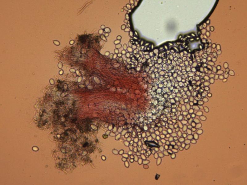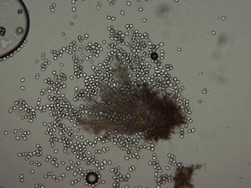 Witn the microscope I saw synnemata of 400x17oµ and hyaline conidia of about 22x15µ. Conidia seemed to be solitary.Conidiophores were subhyaline and not markedly branched.Hyphae were 2µ thick.