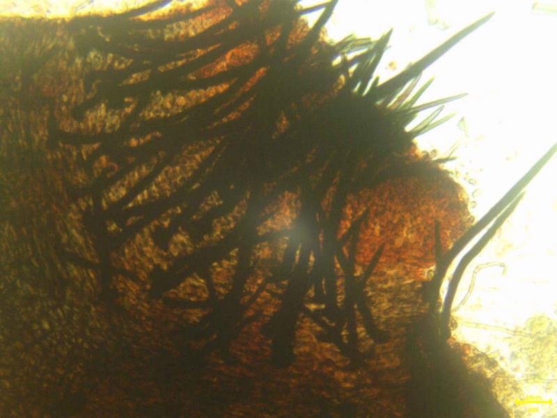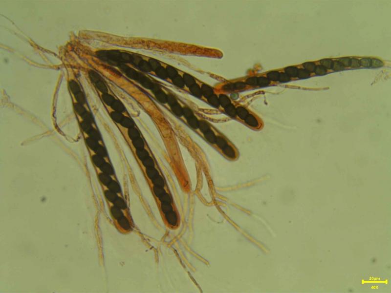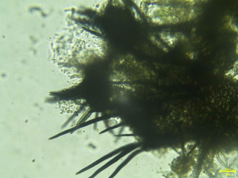 Périthèce translucide immergé dans le substrat, globuleux a piriforme 520x325µm, col court avec nombreux poils rigides, pointus 110 µm en moyenne.Asques octosporés, unisériés 170x15 µm, tholus arrondi. J-. Ascospores avec cloison centrale, un peu rétrécies a cet endroit, entourées d'un gélin, pore germinatif a chaque extrémité, spores immatures verdatres puis noires a maturité 21.5x8.1 µm Qe=2.7. Paraphyses formées d'une succession de celulles allongées dépassant les asques. Nombreux poils apicaux noirs, pointus 110µ. Péridium angularis.