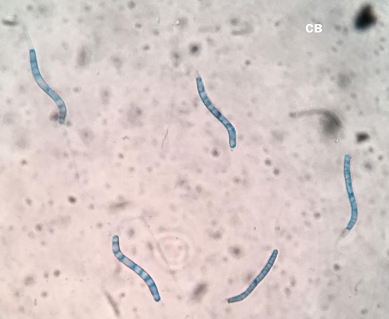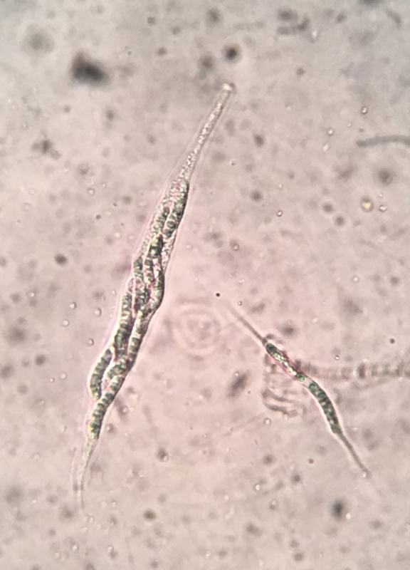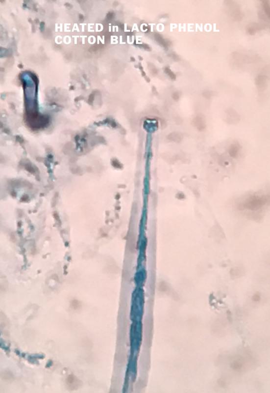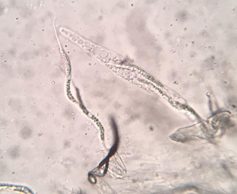 The asci are about 150-175 x 14-18µm, eight spored, with the spores clustered in a group at the center and a long "nose" featuring an apical ring at the tip. I heated the asci in cotton blue to test for the presence of a sub-apical globulus, but without a positive result. (I am not certain holding the slide for 30 seconds in a very hot toaster oven is the correct technique.)