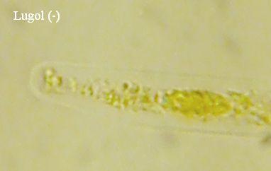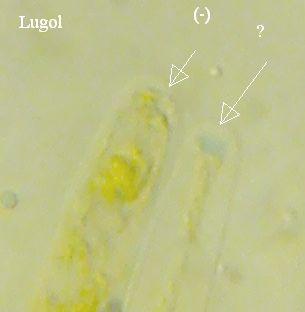 The reaction of porus in my collection was very capricious. Only a few ascus have a slight bluish discoloration of porus. Over 95% of ascus do not show reaction to iodine. In no mature ascus I have not observed a reaction.