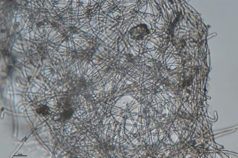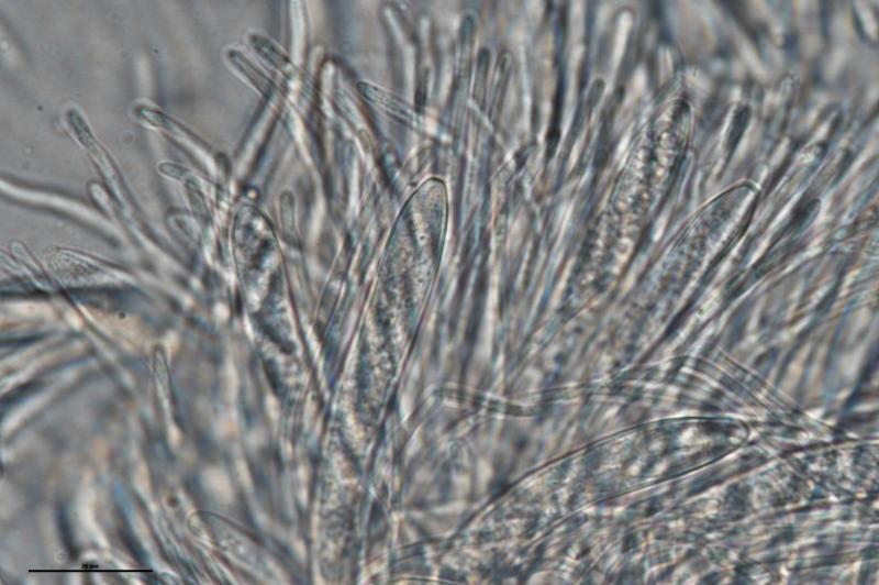 Subiculum is minimal, white and sparse, hyaline. Largest apothecium ~2mm but most smaller. Hairs ~15Oum and septate. IKI +. Crozier +. Medullary excuplum looks textura intricata, closer to edge some ectal more agularis. Paraphyses filiform, septate. 8-spored, ellipsoidal, mostly 3 septate but some only 1. Spores in H2O appear to have appendages but not in 10% KOH or lactophenol blue, maybe they dissolved?