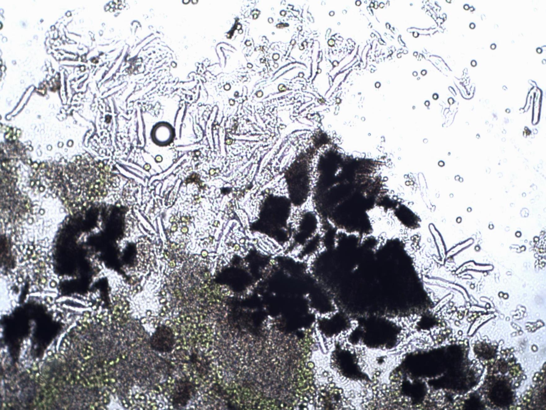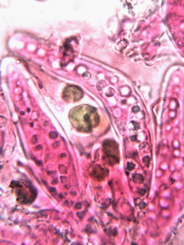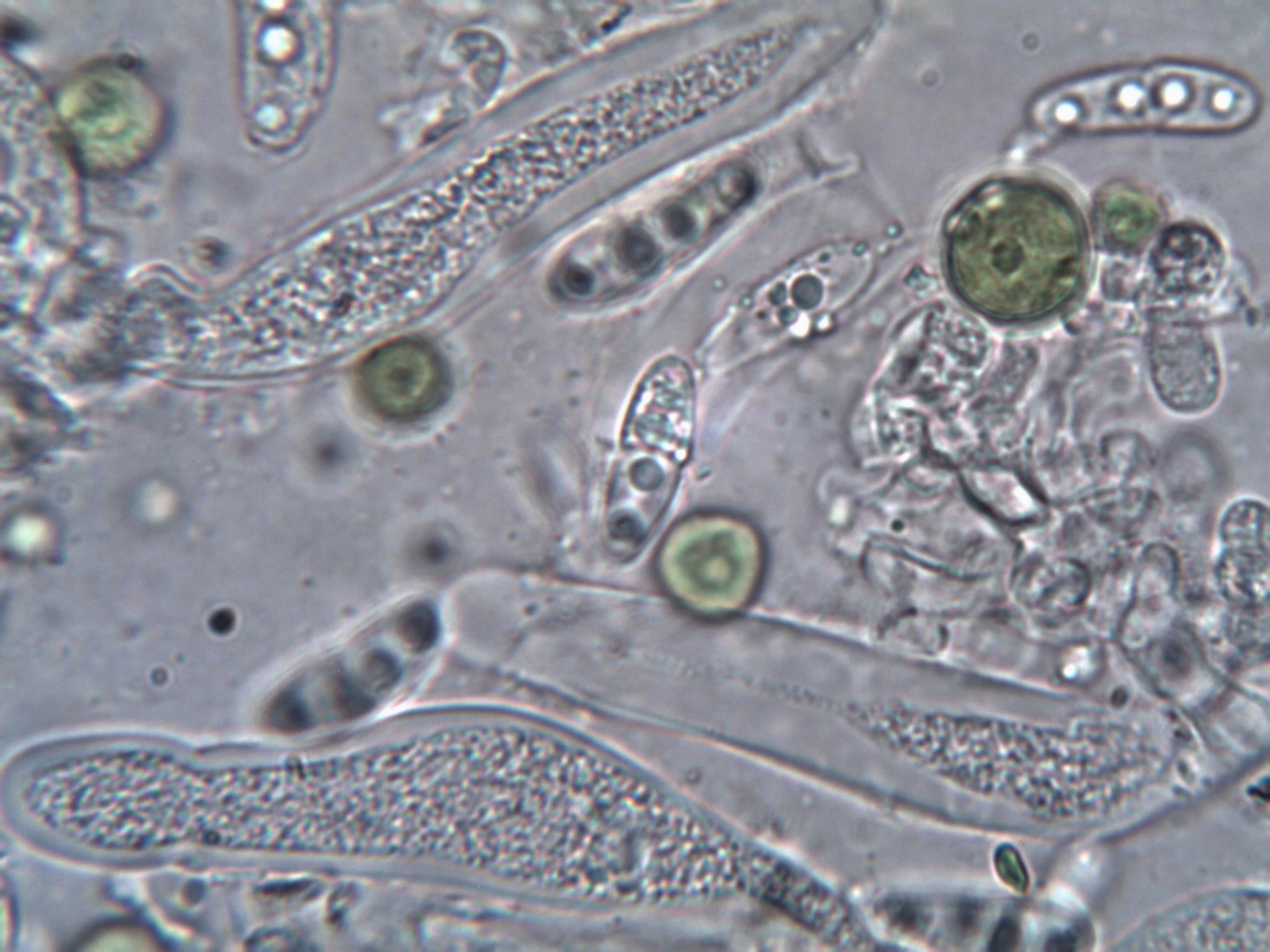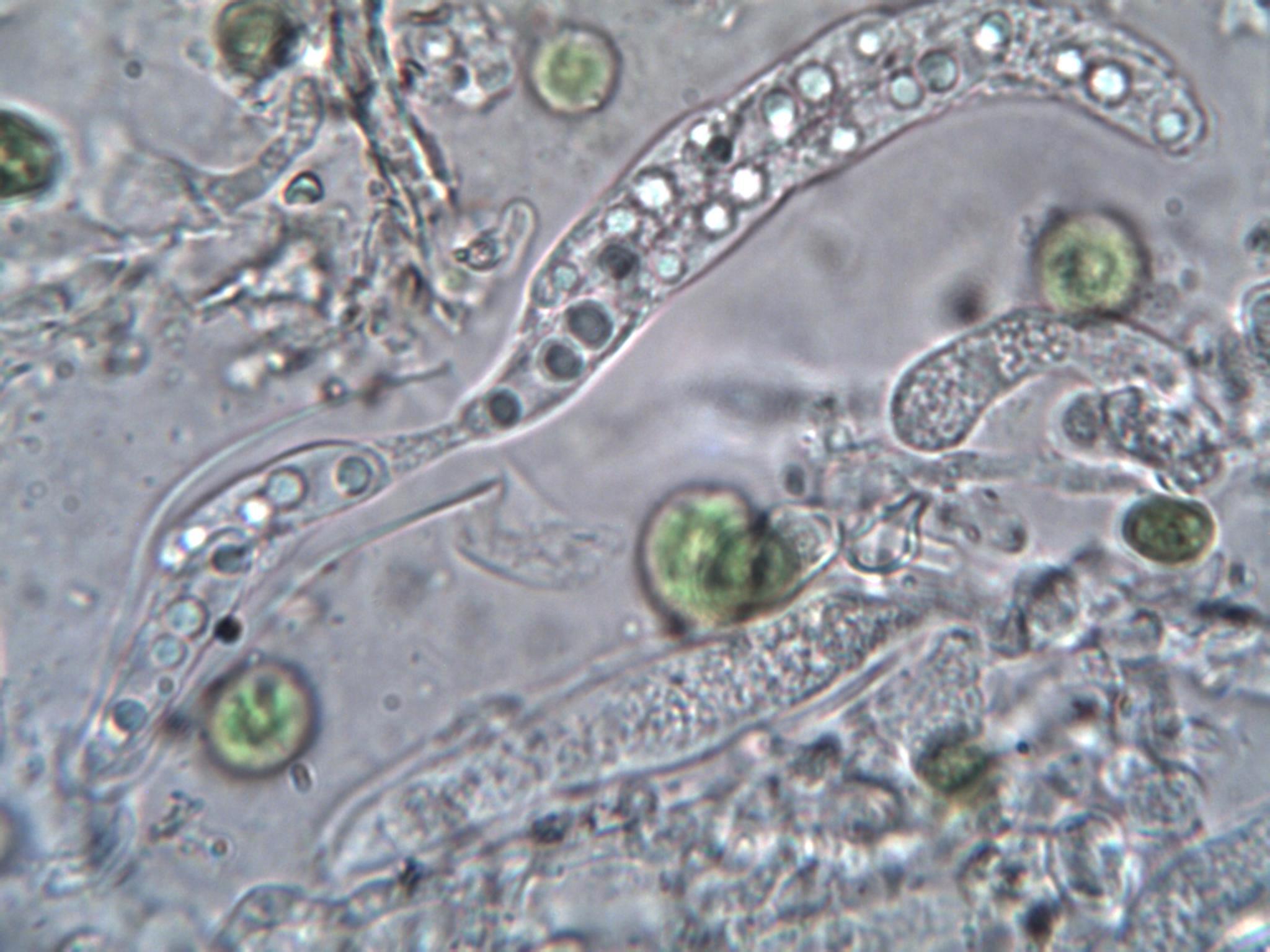 I also attached photos from the microscpy. The spores are hyaline, guttulate, and mostly simple; some appear to have some central septum, being sligtly constrited there, with dimensions: 15.7 - 20.2 × 4.5 - 5.5 µm.
