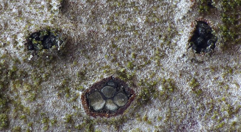 As-tu essayé de faire un section verticale des ascomes. Celle-ci pourrait faire apparaître que ton champignon serait fongicole (sur Diaporthe, Diplodia, Cytospora, ...etc) ? Ce serait une information qui nous permettrait de condidérer des genres connus (voir travaux de Voglmayr et Jaklitsch).