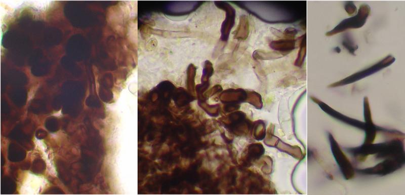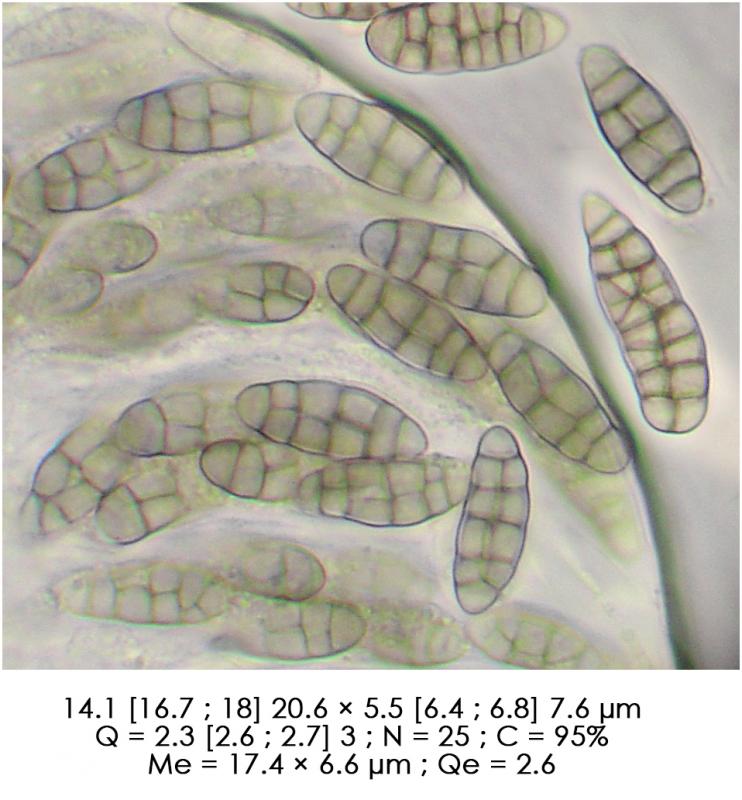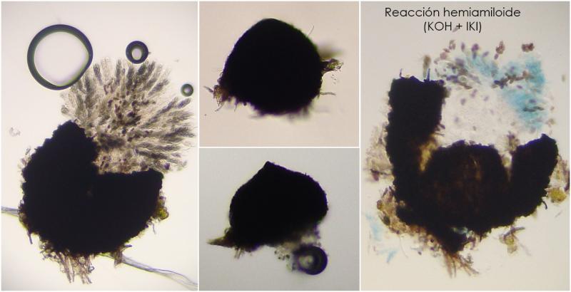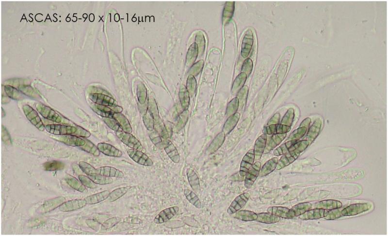 Microscopicamente presenta ascas octosporadas, uni- y biseriadas. No hay pseudoparafisis. Las esporas son muriformes. Y en la superficie del peritecio presenta pelos pero muy escasos, tanto apuntados como redondeados de 15-35 x 2-4.5um.