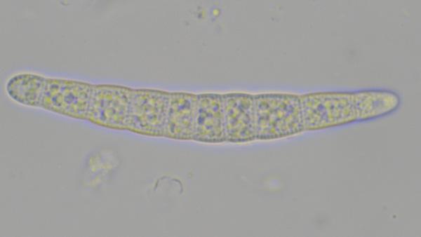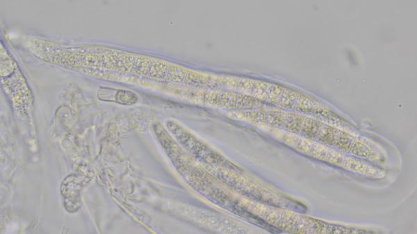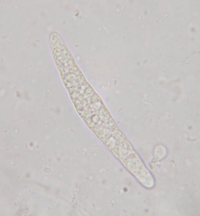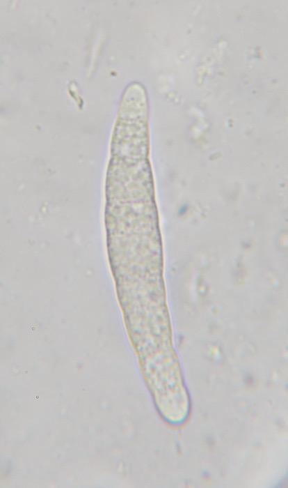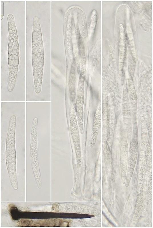 Spores: Hyaline, nearly symmetric, 55-64 x 8-8.5 µm, rather constant in size, strictly(?) 9-septate, with many small droplets inside, ends obtuse.