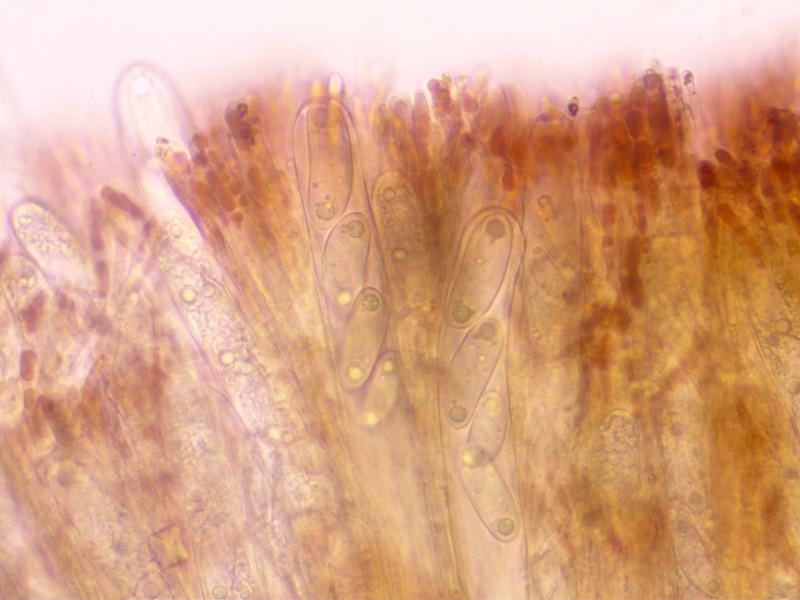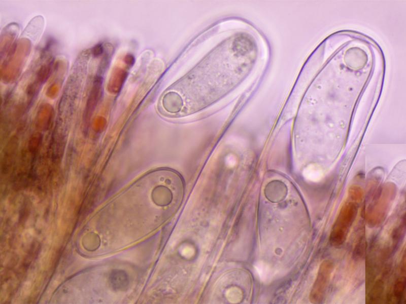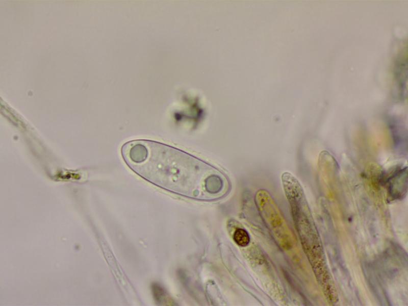 Ascospores:44-50x15-19. Ellipsoid-cylindric, some curved and some with strangely attenuated apices. With polar guttules. With a gelatinous coat.