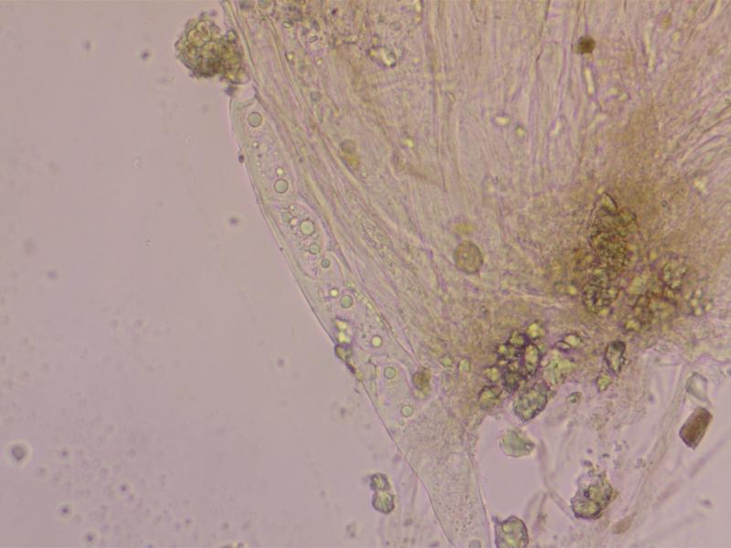 Its the ascus width that I had got wrong-it should be 250-325x18-25, so really quite large. Being Sclerotiniaceous I imagine the fungus would have been associated with plant material perhaps with a sclerotium but, unfortunately it quickly became detached from the substrate. There was some Mnium hornum fairly close but I don't think the fungus was associated with it. The site was in broad leaved woodland with ash etc.