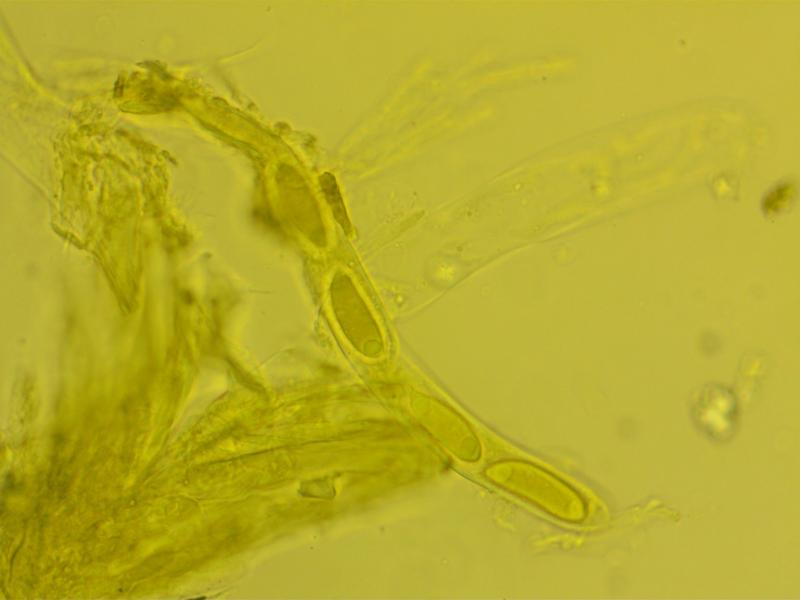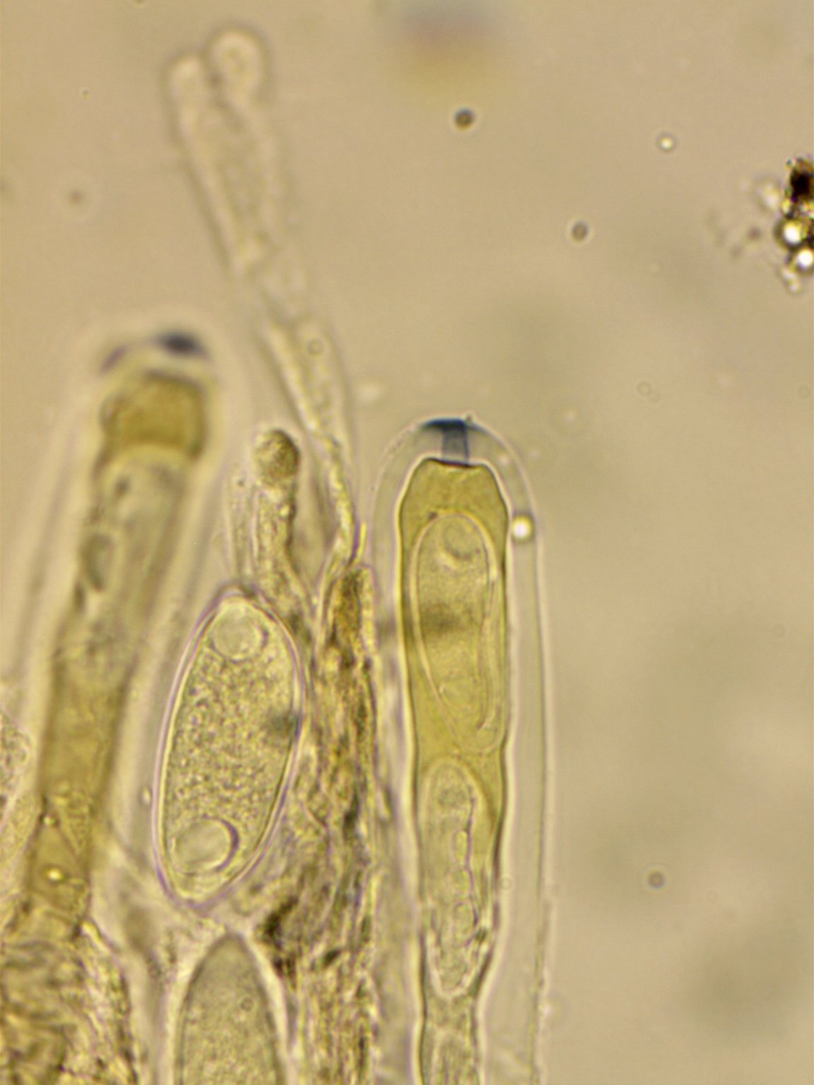 Asci: Cylindric, 250-325x18-25. 4-5 spored, uniseriate, with differetial maturation of the ascospores. Ascus pore blueing in Melzer' after treatment with KOH.