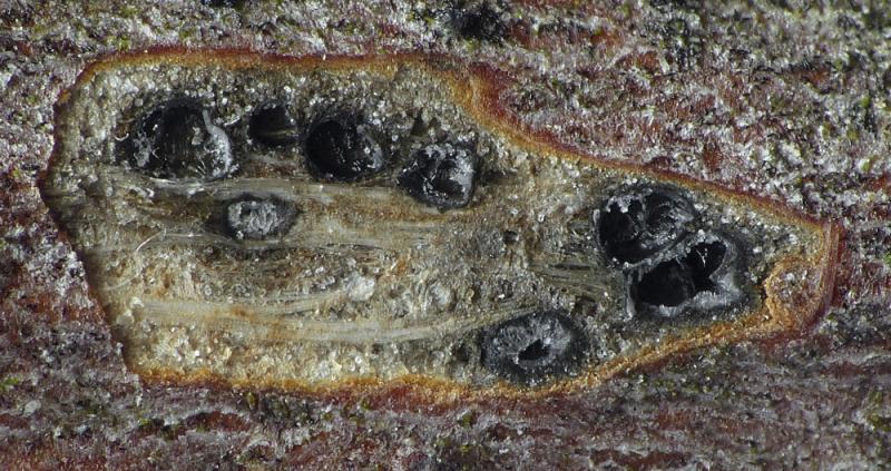 Sur branche morte d'Ulmus glabra, en compagnie de Cryptosporella hypodermia.