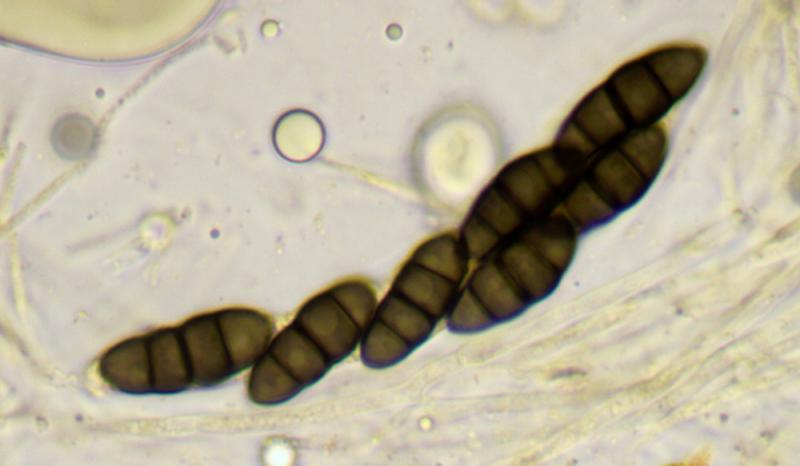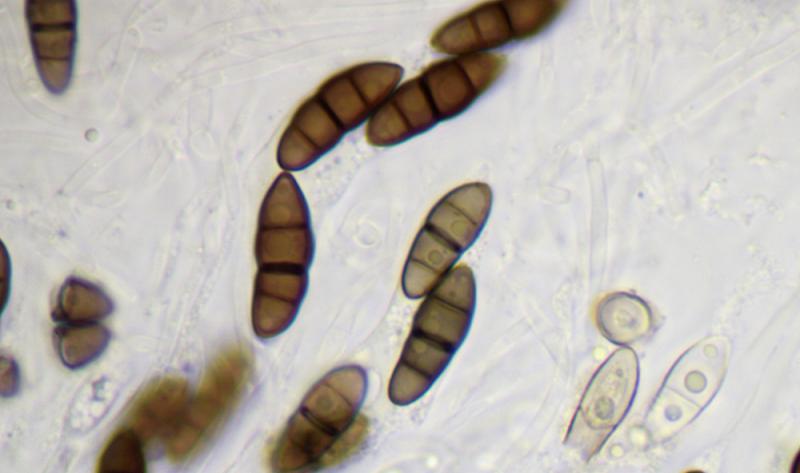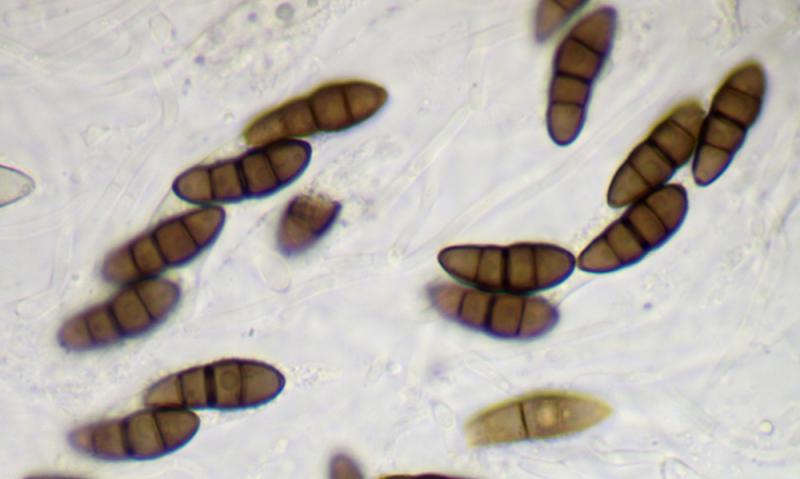 Ascospores : 14-18,5 x 5-6,5 µm, elliptiques, triseptées, rétrécies au niveau des cloisons, à pôles obtus ou aigus, brunes, lisses.