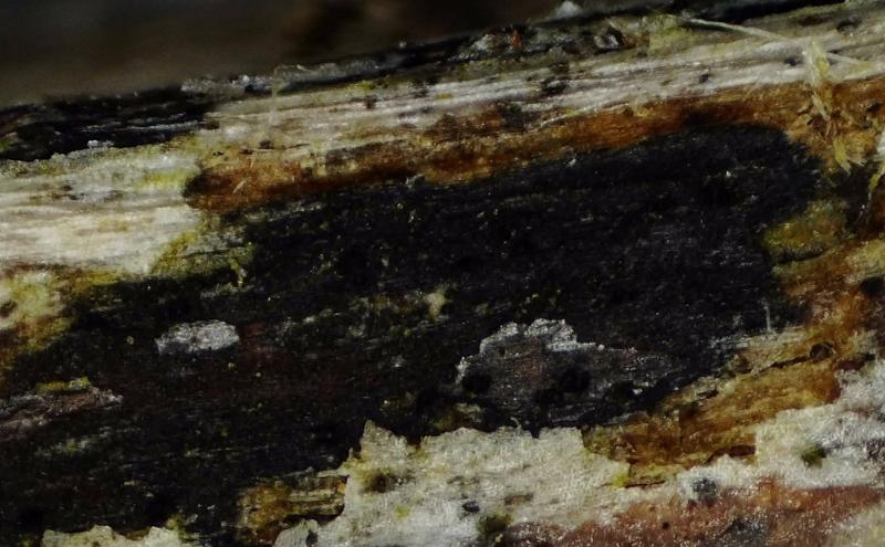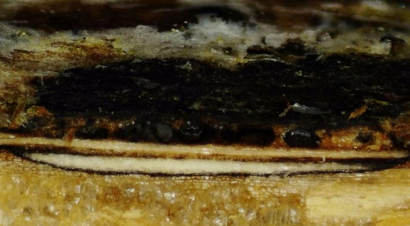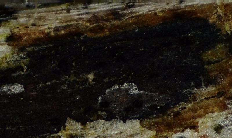 Le bois est nécrosé par plaques en surface, les périthèces immergés dans le bois sont disposés de manière aléatoire. On remarque une ligne de bois nécrosé sous les périthèces.