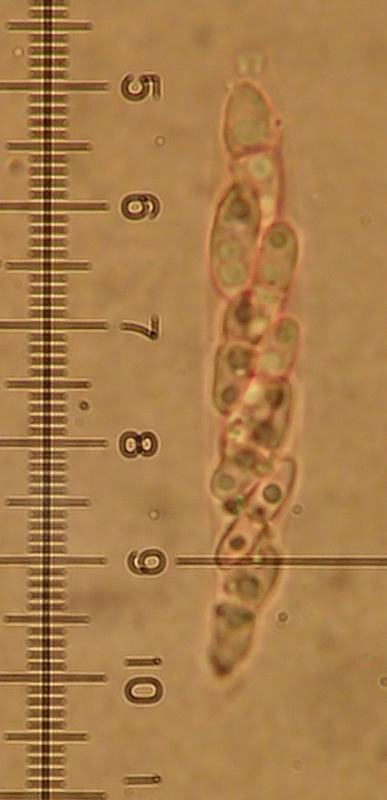 Les spores hyalines ont une cloison centrale et mesurent 10,8-13,9 x 2,8-4,5 um.