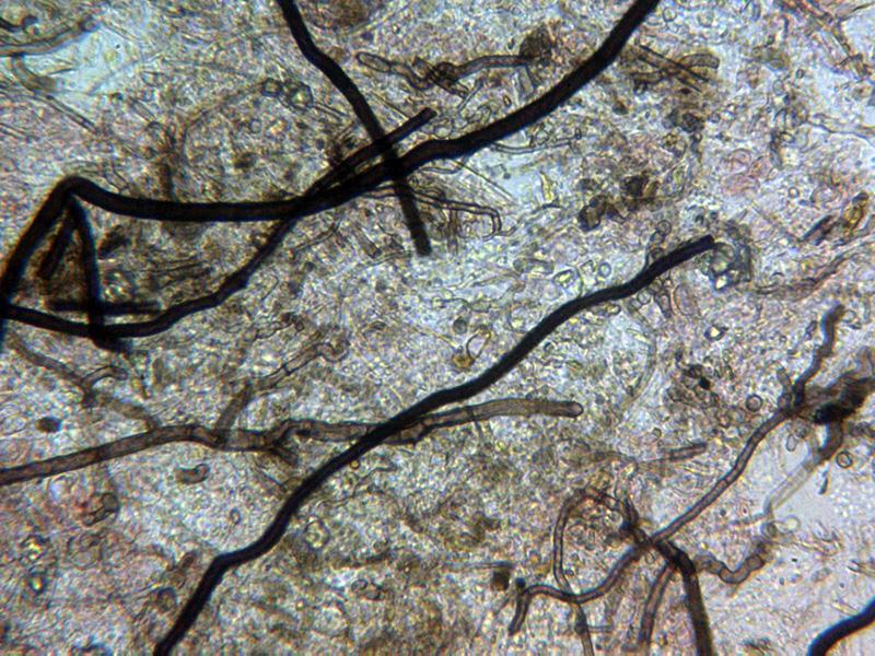 Unos supuestos conidios a modo de gancho o nematodo, cortó fina y con granulaciones que se colorean con el Rojo Congo diluido. Las medidas de los conidios de: