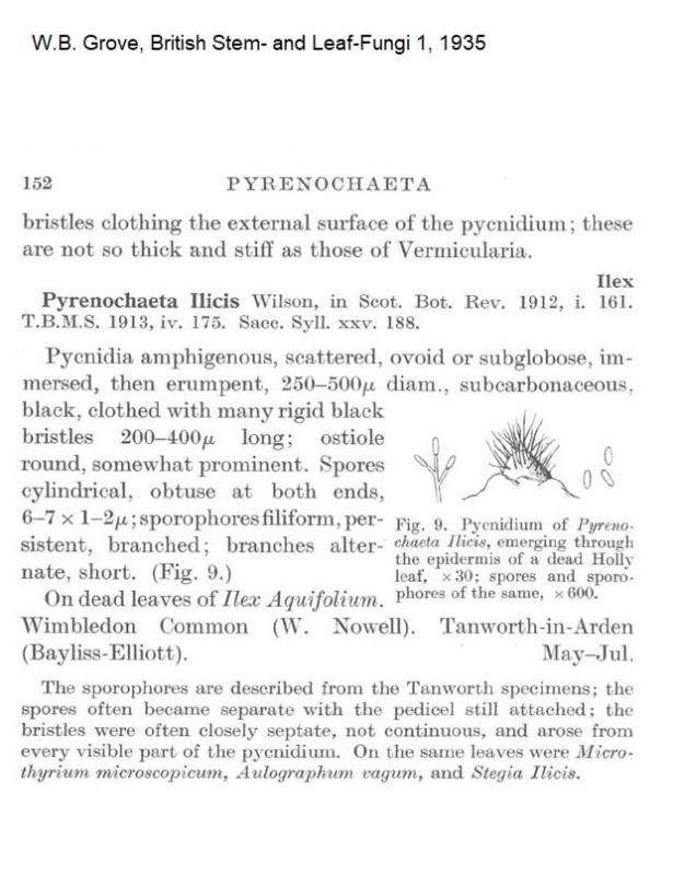 - Microfungi on Land Plants page 148, fig. 648: "pycnidia erumpent up to 0.8 mm diam. brown to black, setose. Setae around ostiole, tapered, septate, dark brown up to 250 x 10 Conidia hyaline 7-9 x 1-1.5, on dead leaves".