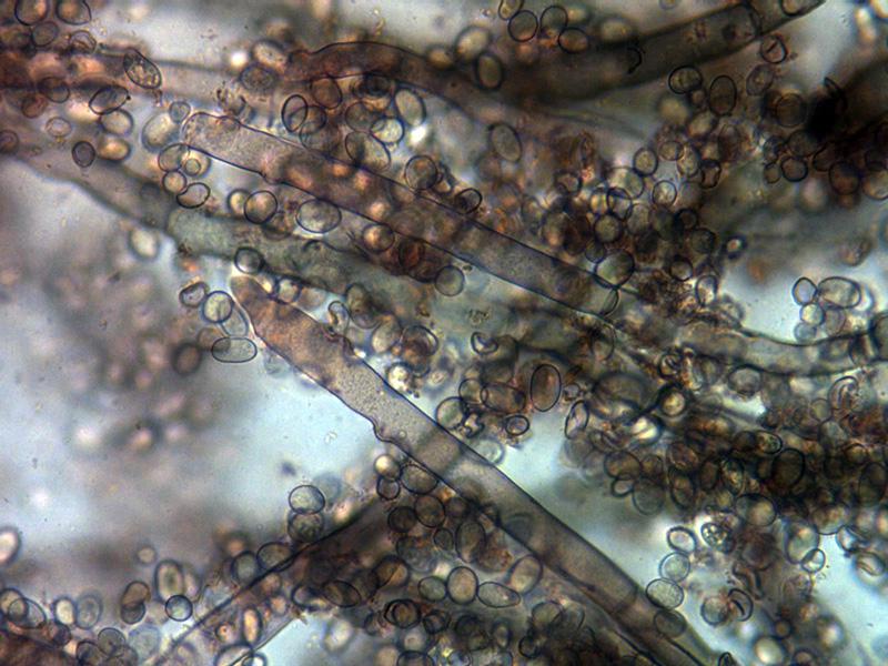 Por la conidiogénesis observada descarto de entrada ya a Haplotrichum, género que ya estudié en múltiples ocasiones. Como se observa alguna espora esférica tampoco descarto por completo que pueda tratarse de un parásito de algun Mixomiceto, es que no tengo ni idea.