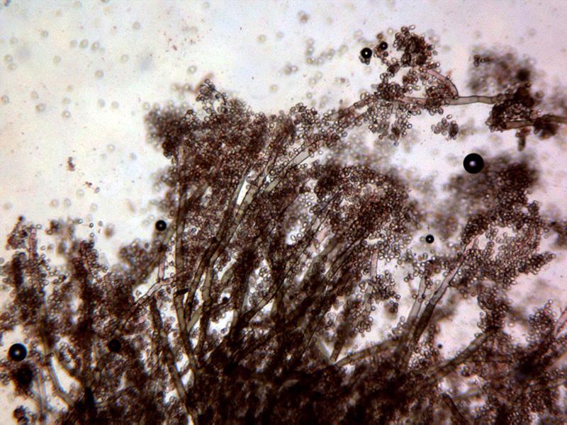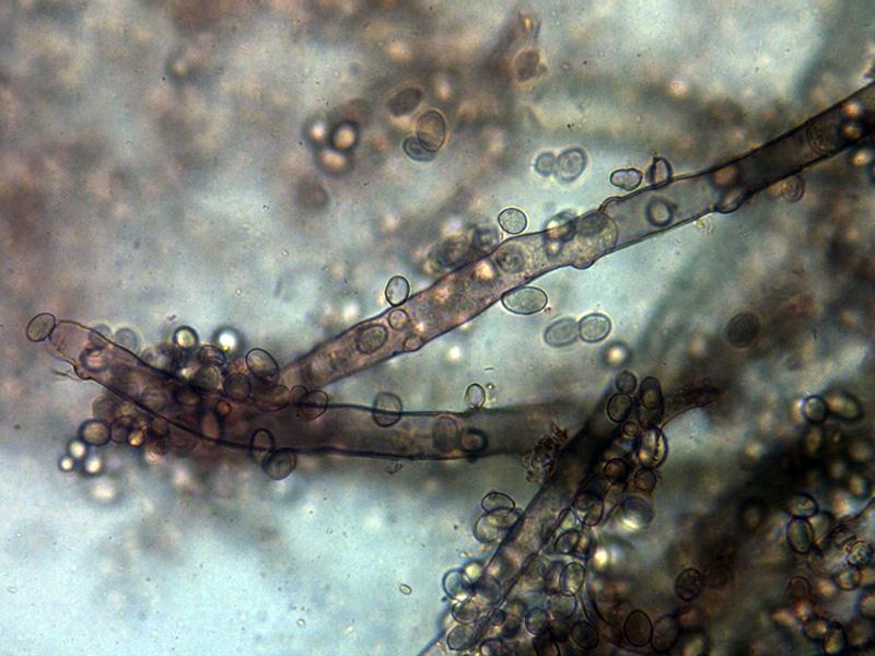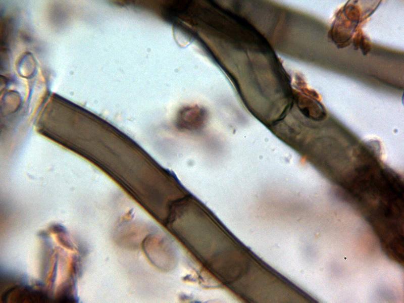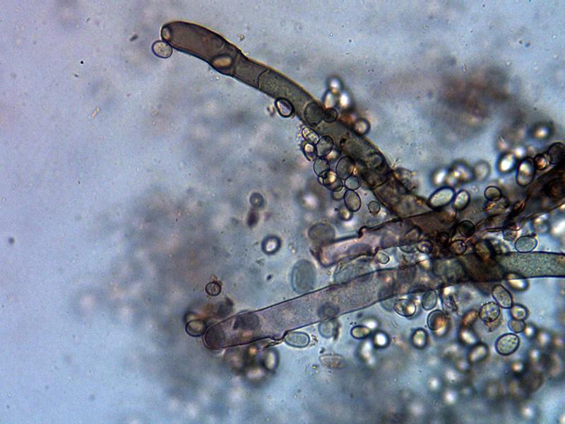 Hifas conidiógenas ligeramente pigmentadas, con pocas ramificaciones y septos simples, con una anchura de entre 11,3 a 17,5 µm.