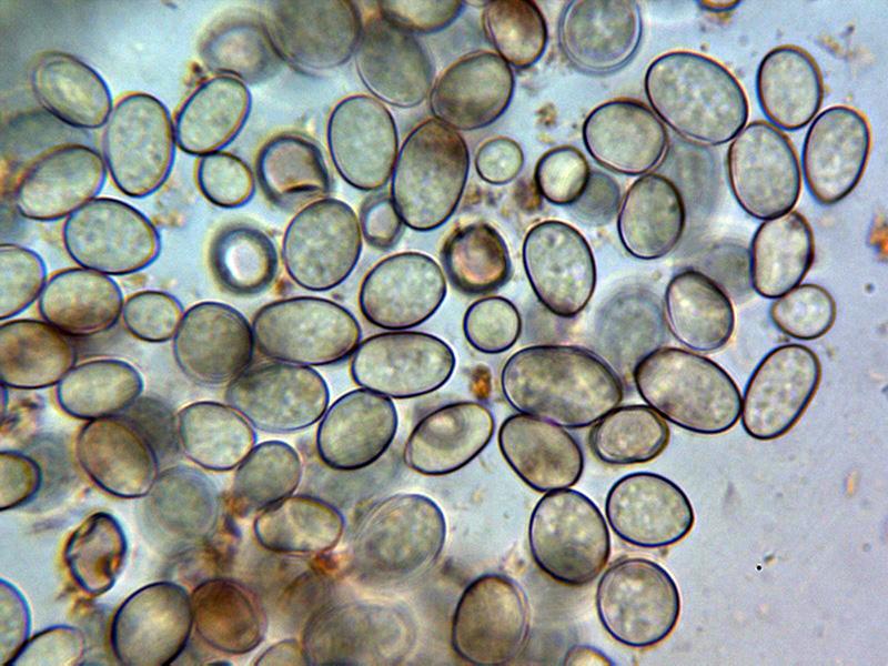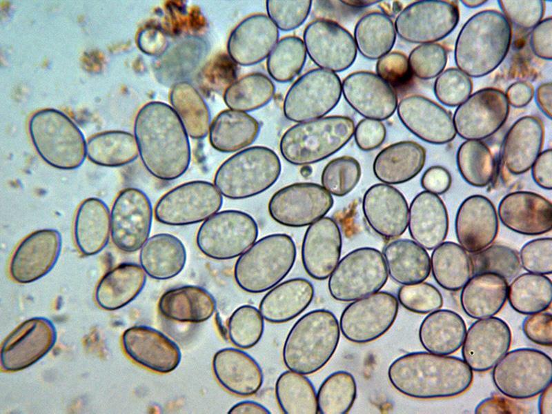 Conidios de ovoides a ampliamente elipsoidales, con tenues granulaciones en su inteior y unas medidas de: