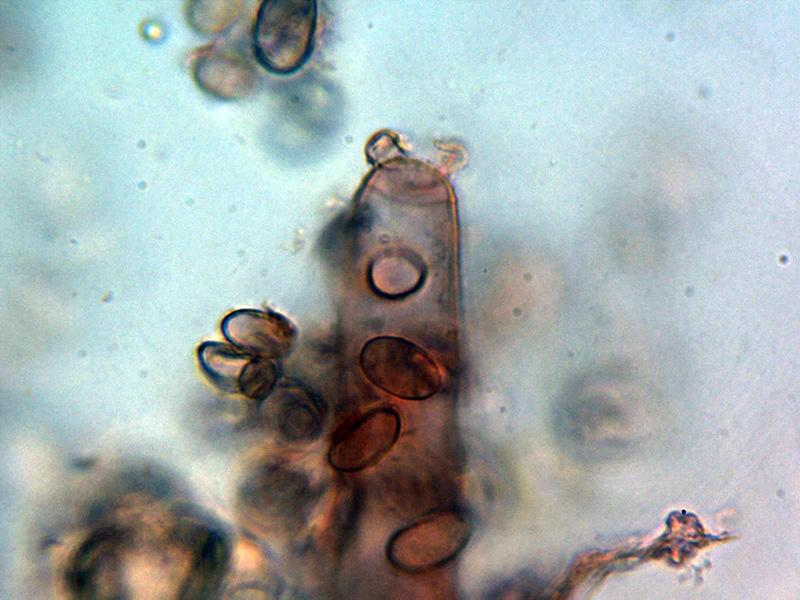Diminutos apotecios de forma entre globosa a elipsoide, de entre 3,7 a 4,4 mm. de largo por 2,4 a 2,6 mm de ancho.