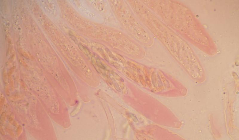 Les asques doivent avoir 32 spores, mais il est difficile de les compter.