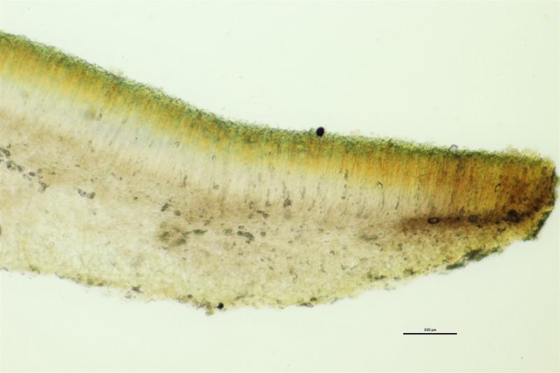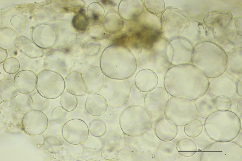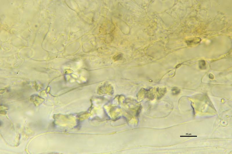 Con cristales, sobre todo en los tejidos del excípulo medular y el estípite.