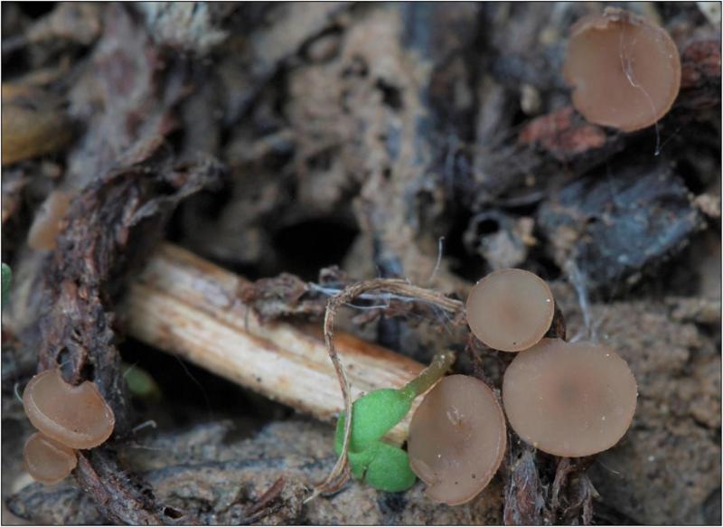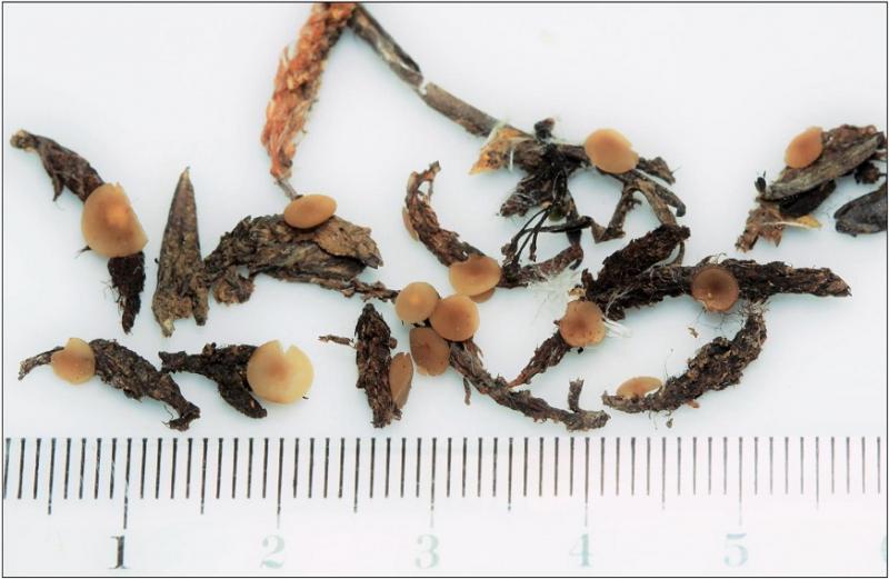 He repasado las fotos de los apotecios recolectados y todos crecen directamente de los amentos y no de las hojas, ha sido un error mío al no fijarme bien, los hongos crecían en un colchón de restos degradados de la planta y en ocasiones parecían que emergían directamente de las hojas más superficiales, al mirar bien las fotografías se aprecia perfectamente los amentos del Salix pegados justo por debajo de la hoja.