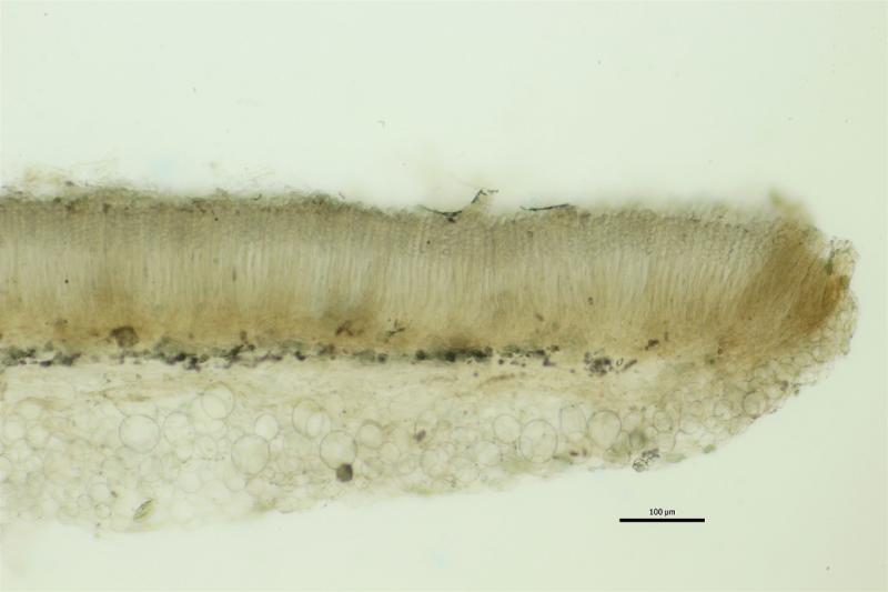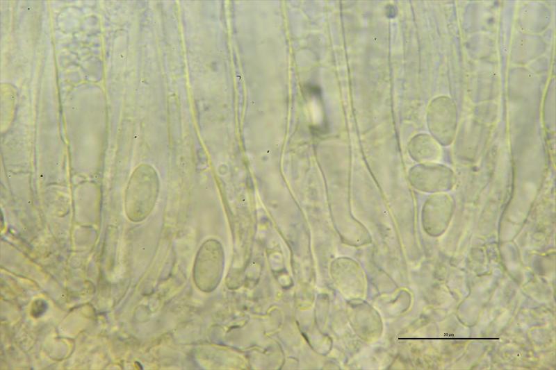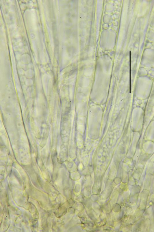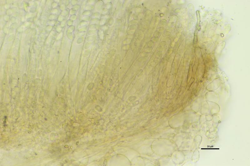 Paráfisis ligueramente ensanchada en el ápice 3,00-5, 80 µm, en ocasiones bifurcada en lo alto, con pequeñas vacuolas no refractivas en CRB.