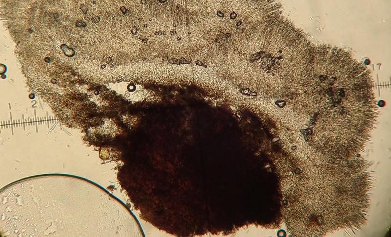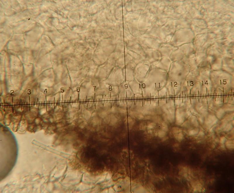 Excipulum formé d'une couche de cellules rondes brun-noirâtre devenant ensuite hyalines. Sous hymenium de textura intricata.