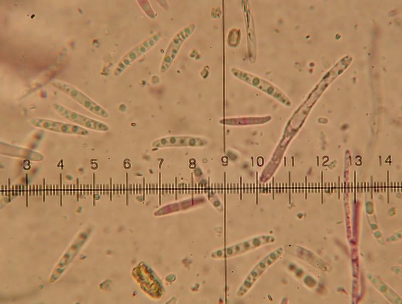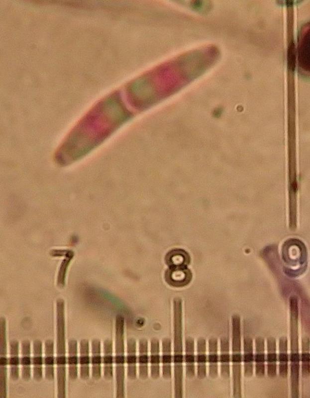 spores avec souvent 1 cloison (parfois 2-3), mesurant 17,5-20,7 x 2,7-3,4 um