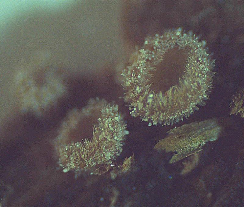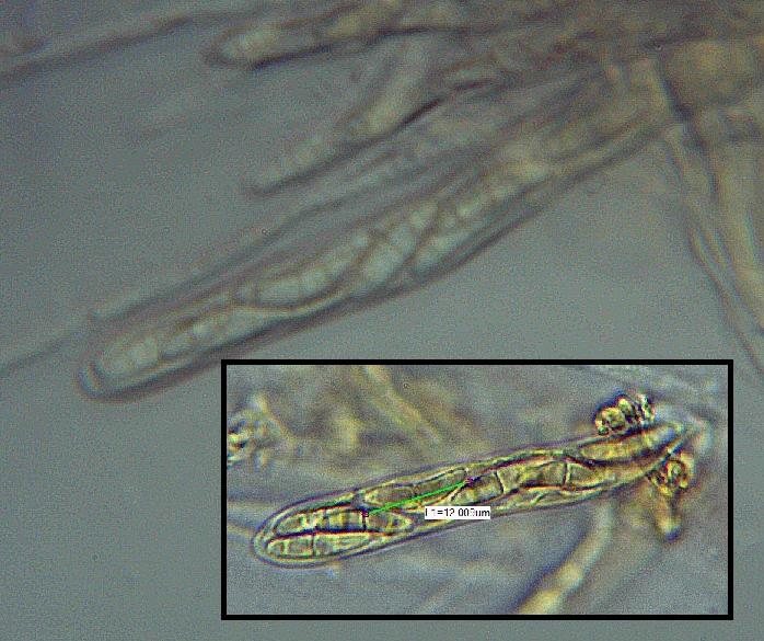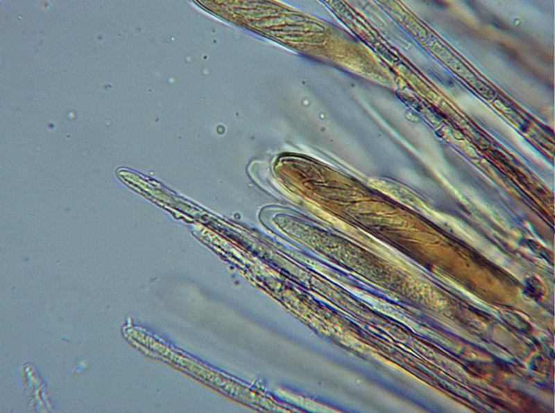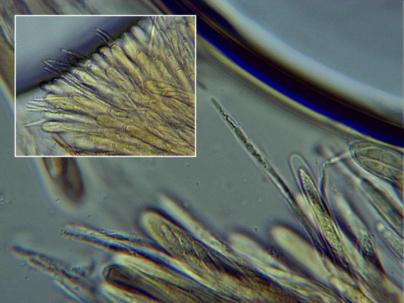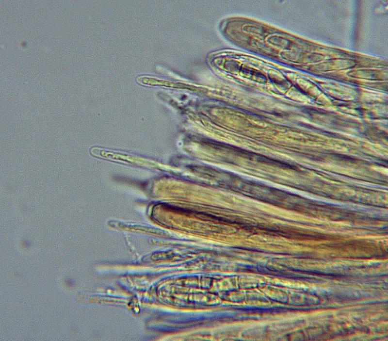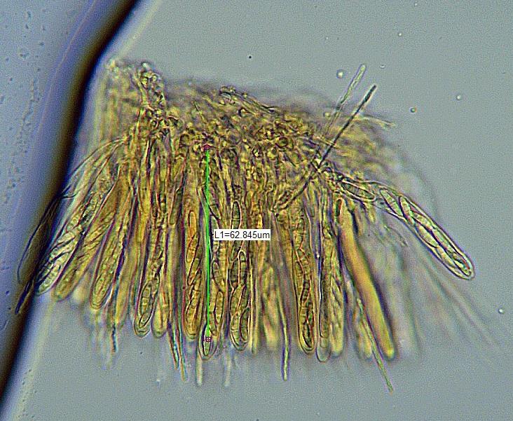 Hi, First time here, and in English so hope can translate easily. Found this tiny hairy ascomycete under small twig at side of stream. Noted that the hairs push towards the margin. The spores look good for this species to me but first time seen and worse still, only fourth record in UK if correct. Can anyone cast an eye and experience across what I can provide here. Asci 60µm plus with para. riding above by around 16µm. Spores shown on pic. Spores with single septa, although appears more thann this inside ascus.with many thanks Tony Hardware Cornwall UK (Cornwall Fungus Recording Group)