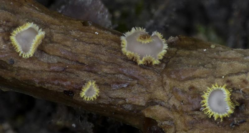 This is difficult. You can compare Trichopeziza subsulphurea, but your spores are a bit longer. T. violascens is also similar. See my directory Trichopeziza with brown lumps.