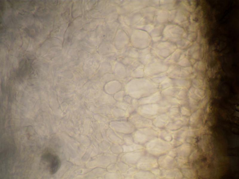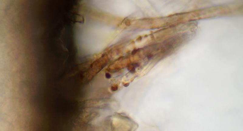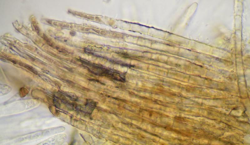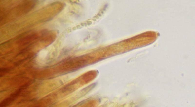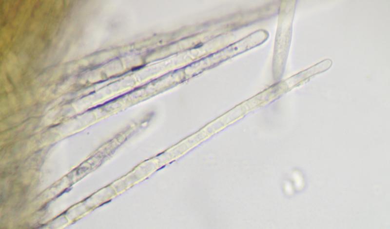 Poils : 160-190 x 3,5-5 µm, cylindriques, généralement amincis au sommet, septés, granuleux, jaunes avec le sommet hyalin. Les poils de la base ont des gros granules bruns.
