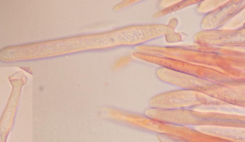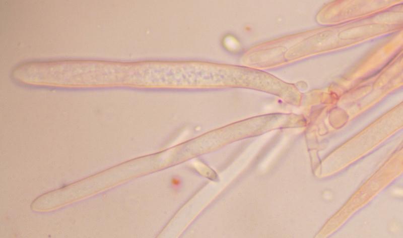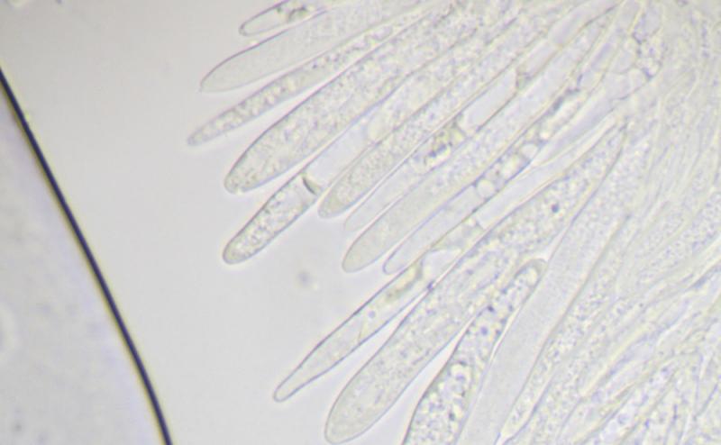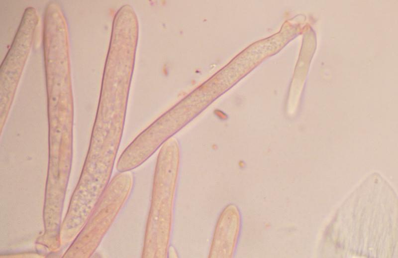 Asques : 60-65 x 5,5-6,5 µm, cylindriques, à base simple, mais généralement avec des protubérances septées, parfois des vrais crochets (?), à sommet hémiamyloïde, contenant huit spores.