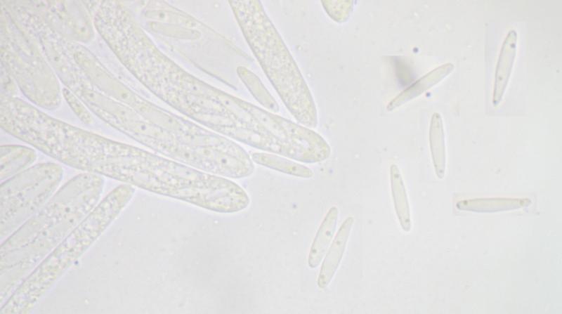 Ascospores : 9,5-14 x 1,8-2,7 µm, étroitement elliptiques, souvent un peu claviformes (une extrémité plus large que l'autre), hyalines, sans goutte, lisses.