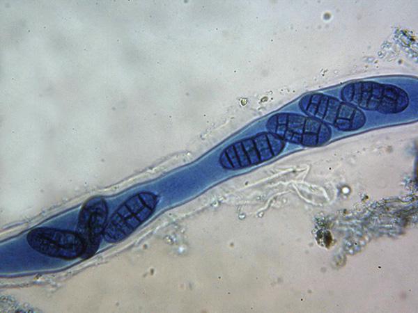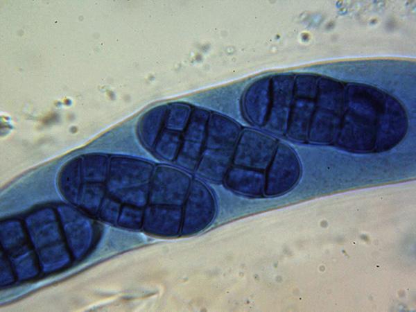 Ascosporas de entre 3 y 8 esporas por asca, con unas medidas de medios de 250 x 36 µm.