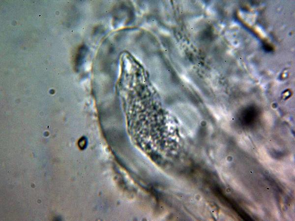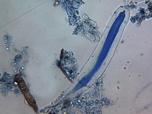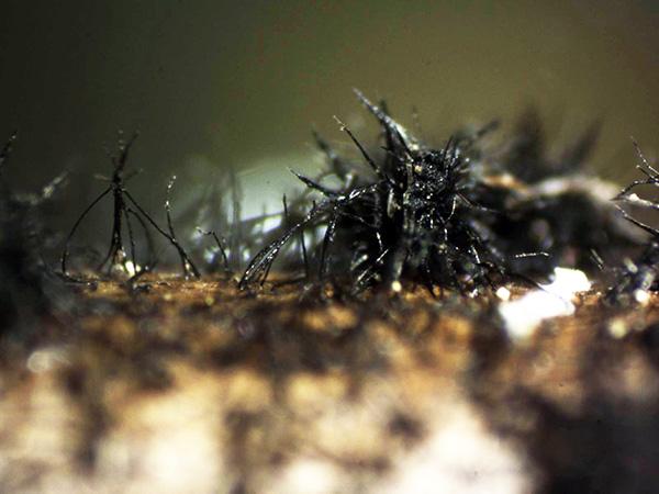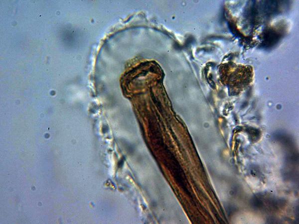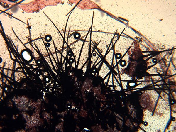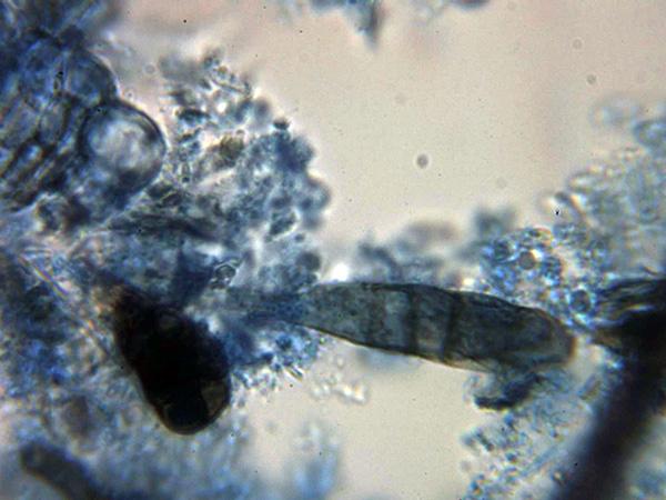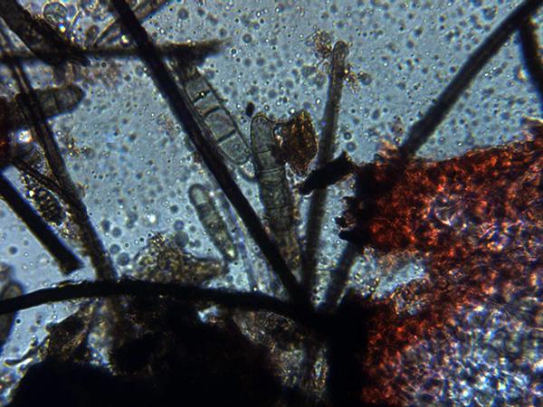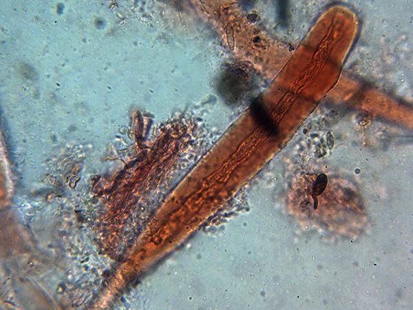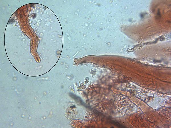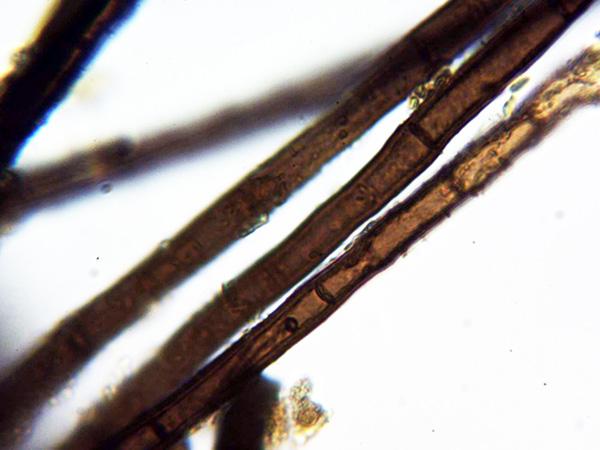Pelos externos de color marrón, septados y que oscilan sin licuar con KOH al 20%