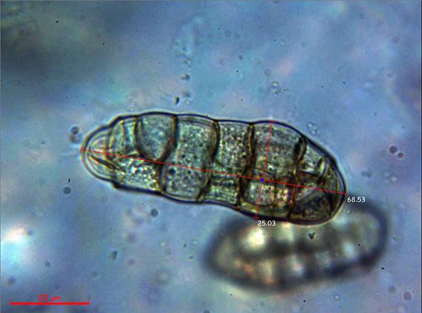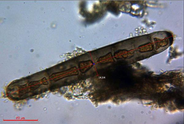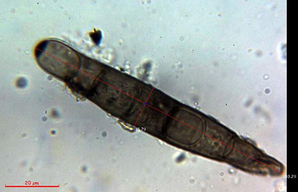 Visto en las muestras algunos conidios tamaños grandes entre 76 - 103.69 (103.7) × 13.7 - 16.4 µm.