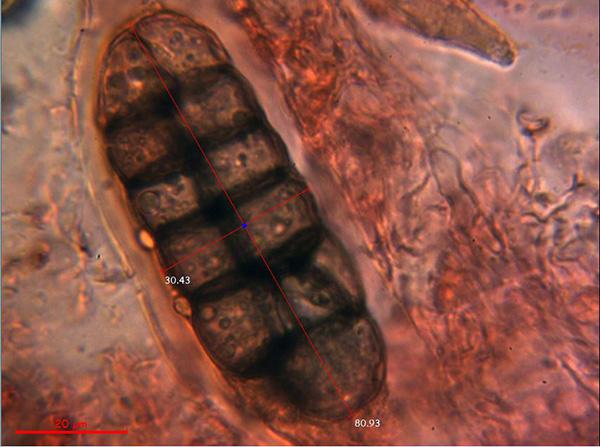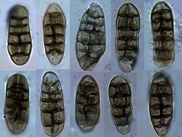 Ascosporas de grandes dimensiones con un septo longitudinal y 5 o 6 septos transversales, mayoritariamente con unas medidas de (50) 51.7 - 59.9 (62.3) × (20.2) 20.4 - 22.6 (25.6) µm. con un medio de Me = 55.8 × 21.6 µm; Qe = 2.6, algunas de ellas superaban con longitudinal longitudinal las 80 µm.