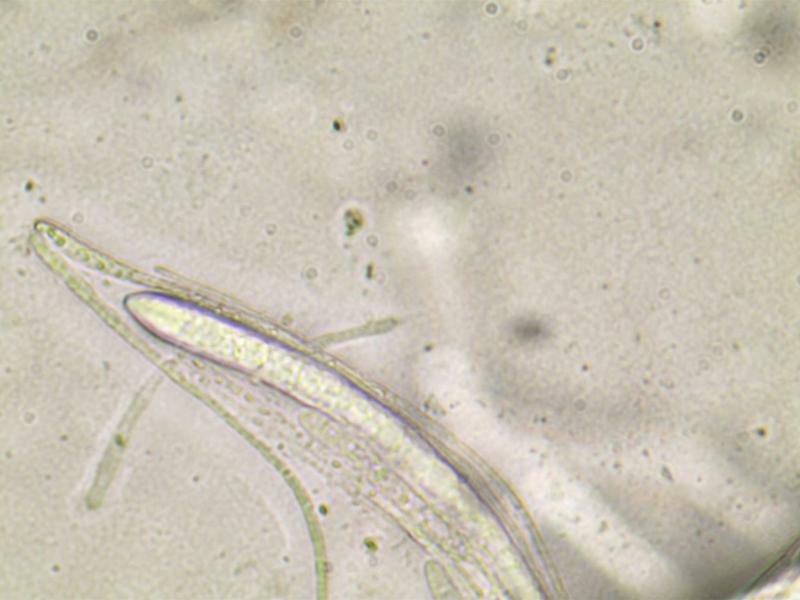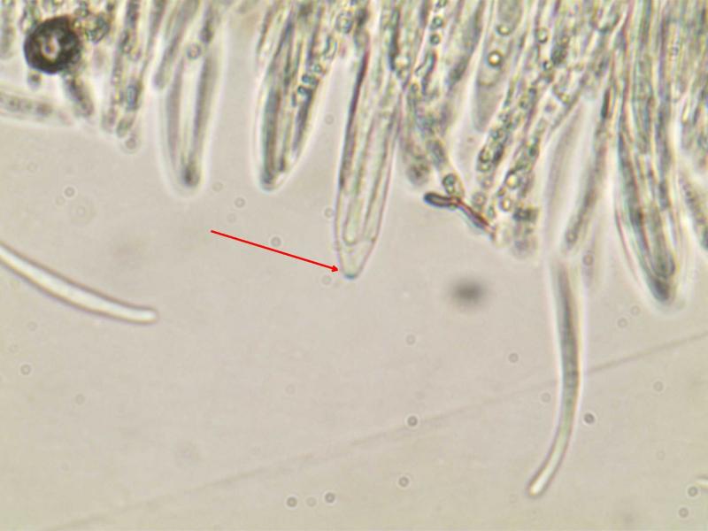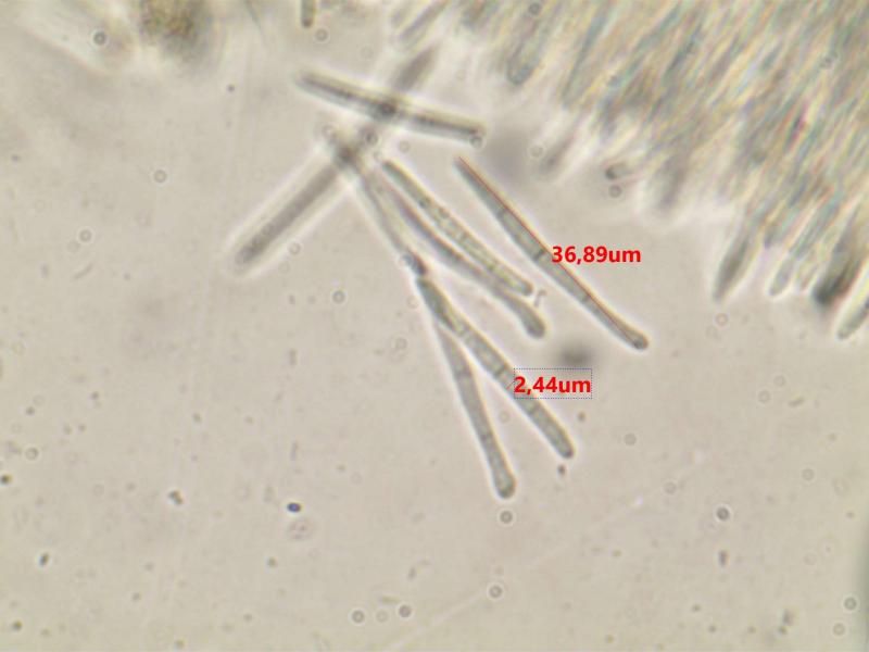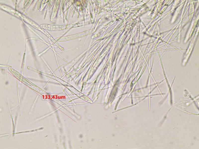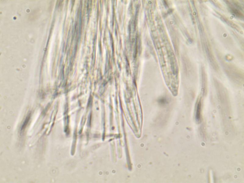 Pas de macro, désolé. Petit (diametre max de 1mm) disque mollisoïde, sur tige de juncus effusus de l'an dernier, au bord d'un petit ruisseau. Spores séptées 4 fois (déjà dans l'asque) 37X2.5 µ, asques J+, apparemment 4 spores par asque. L=135µ, avec crochet.