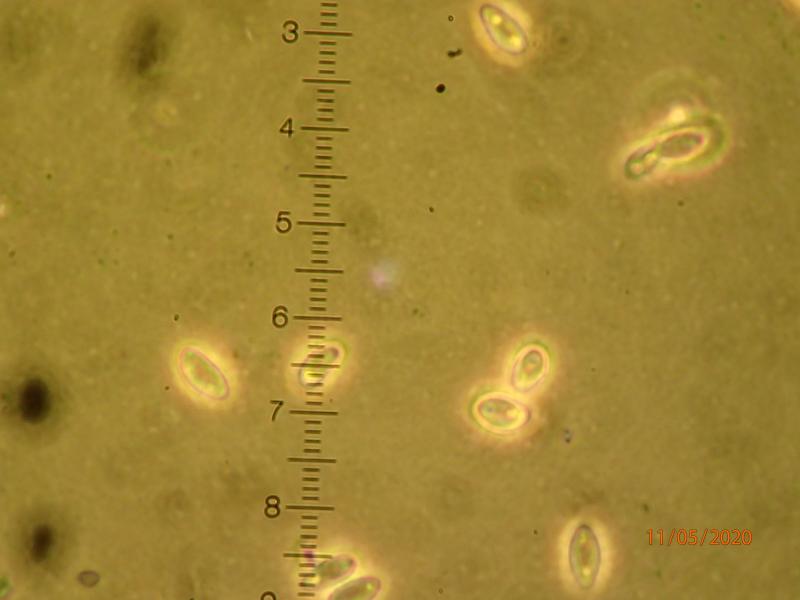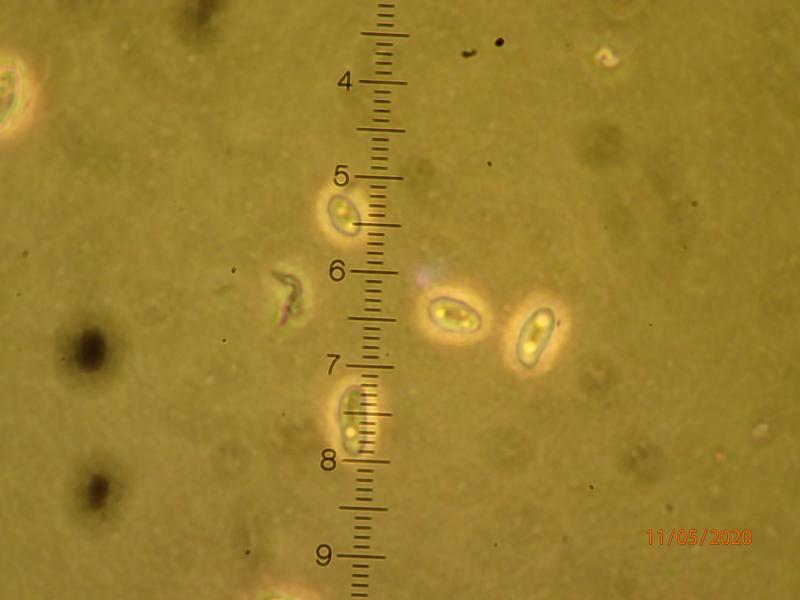 Very small (up to 0,2 mm diam.) whitish apothecia on resin from Picea abies (Norway). Short (~as high as diam.) stems. Ascospores 6-8 x 3 microns, with two refractive bodies, ellipsoid to broadly spindle shaped. Asci not discernable. Short hairs, approx. 40 microns long (?), with some sort of incrustations. Stem base pigmented, pseudoparenchymatous. Iodine reaction not checked. Mounted in water (dry specimen, a week old). Three of photos in phase contrast to enhance visibility.