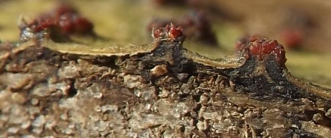 Is it a parasitic species, I can not tell. Microscopic studies do not confirm this, but macroscopically it can be seen that the fruiting bodies of Nectriaceae grow on some other medium?