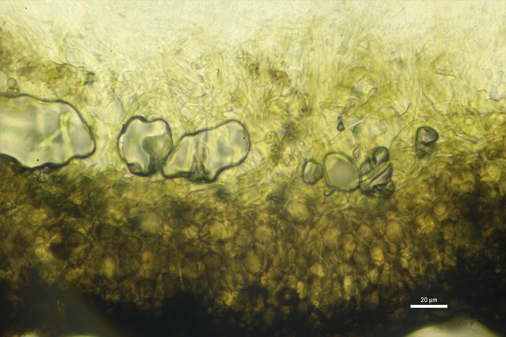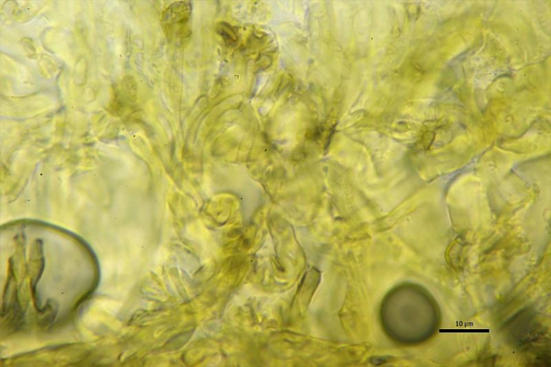 Todo el excípulo se vuelve rápidamente amarillo en contacto con KOH5%, claramente visible incluso en el cristal cubreobjeto.